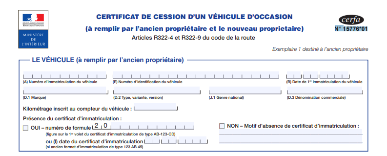 Un certificat de cession pour destruction que vous trouverez en préfecture ou directement sur notre site : Certificat de cession (N°15776*01) .