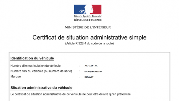 Un certificat de non gage de moins d’un mois (certificat de situation administrative) disponible en préfecture ou sur Internet : Certificat de non gage.